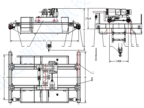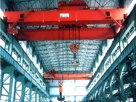 QD型吊鉤橋式起重機,主要有橋架、大車運行機構、小車、電器設備等組成。根據使用頻繁程度不同,分為A5、A6二種工作級別。該起重機動作操縱全部在司機室內完成,