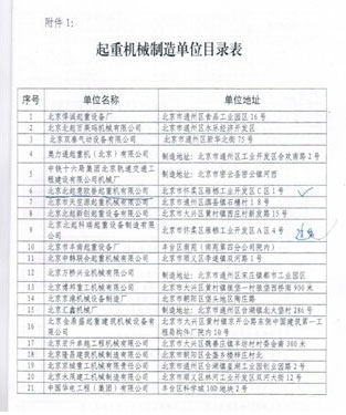 5.2011年6月28日,北京市質(zhì)量技術(shù)監(jiān)督局下發(fā)文件“京質(zhì)監(jiān)特設(shè)發(fā)(2011)232號”,轉(zhuǎn)發(fā)國家《關(guān)于注銷新列入淘汰目錄的特種設(shè)備制造許可證的通知(國質(zhì)檢特函〔2011〕369號)》,并明確北京市起重機(jī)械制造單位目錄表。